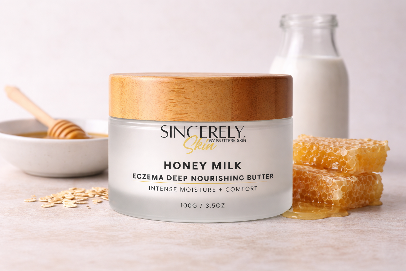 Warm a small amount between palms and massage into skin—especially elbows, knees, hands, and dry patches. Use alone or layer over Honey Milk Body Crème for your ultimate Hydrate + Seal ritual.