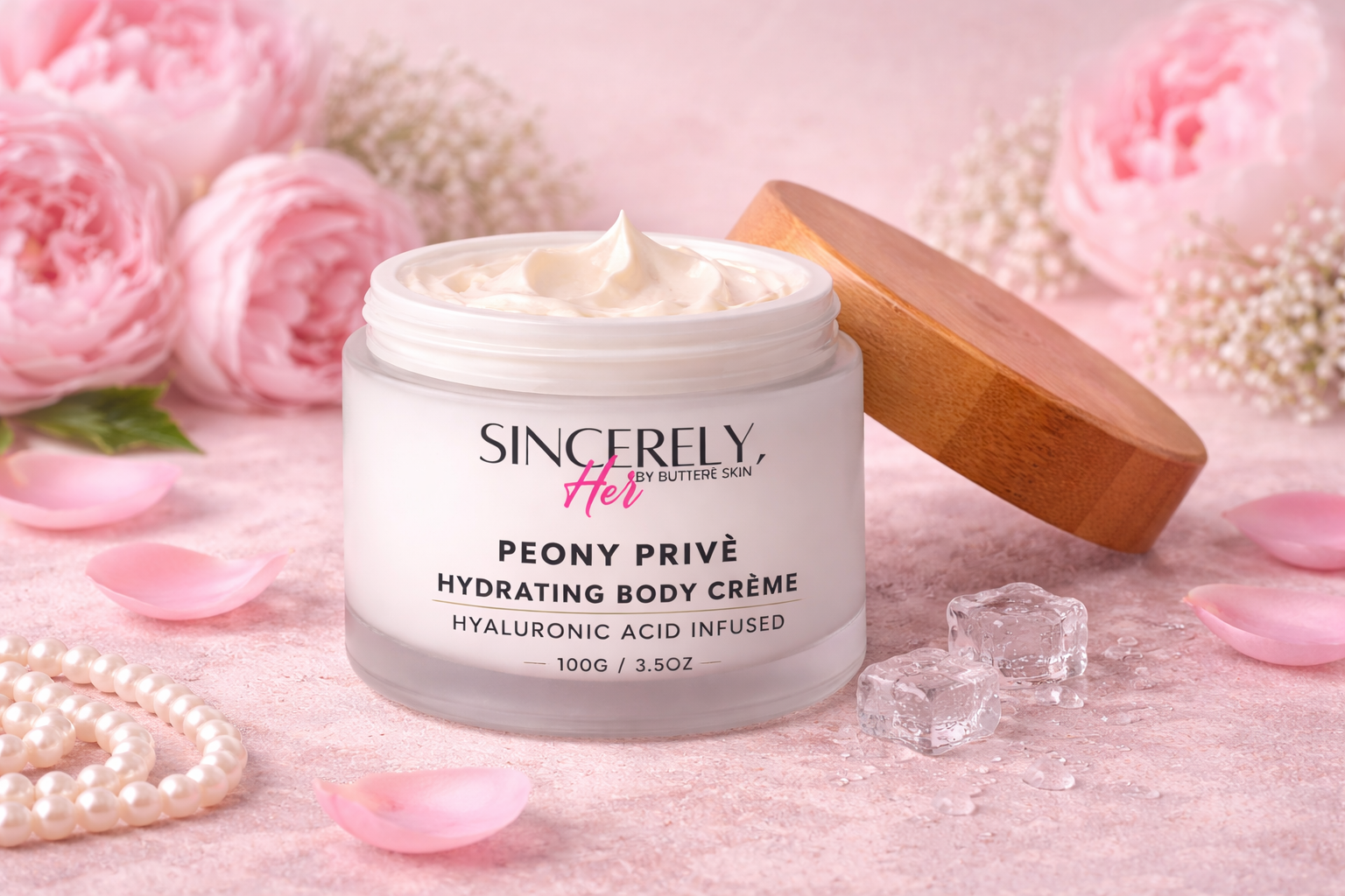 Peony Privè — Sincerely, Her Hydrating Body Crème wraps the skin in rich moisture, lasting hydration, and plush softness with every use. This thick, creamy body crème melts beautifully into the skin, helping to replenish moisture while leaving skin feeling smooth, comforted, and softly radiant with a lightly rich finish.
